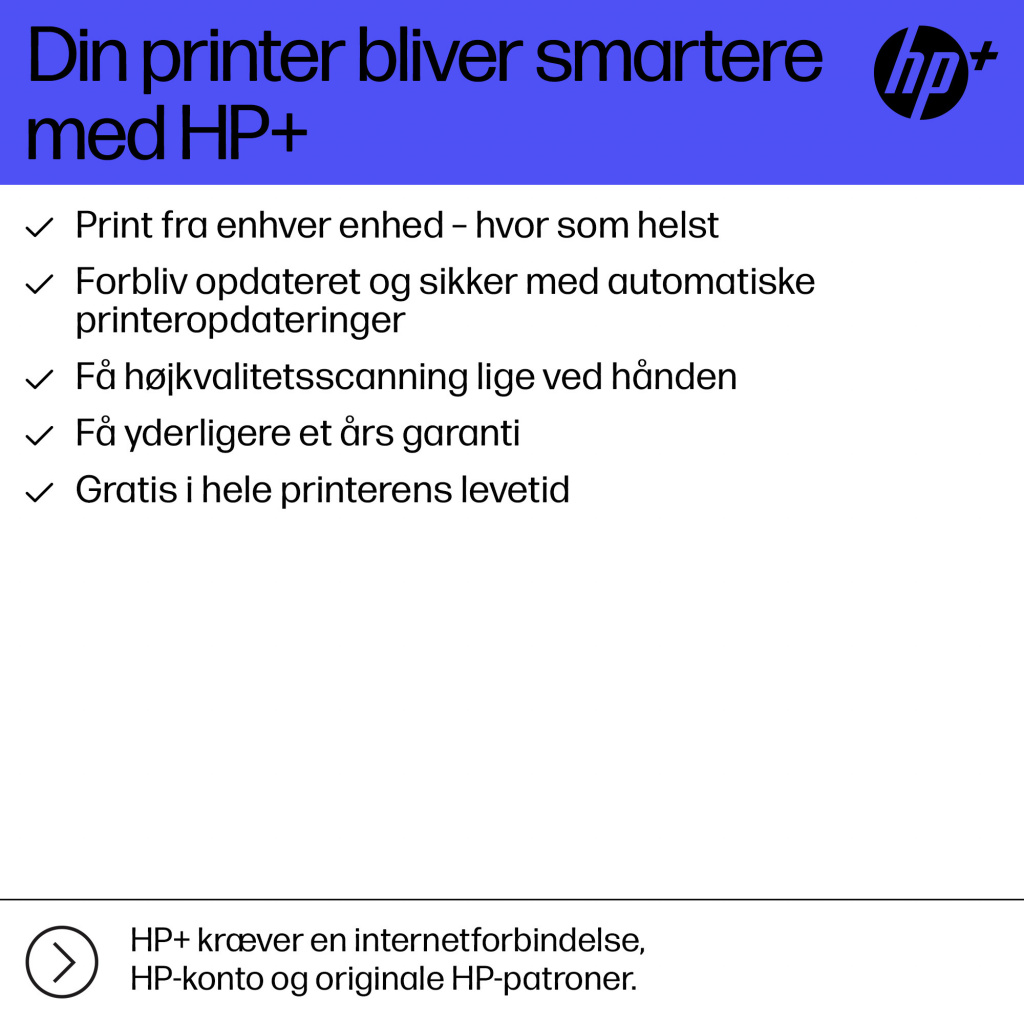 Dette er en HP+-aktiveret printer. Vælg HP+ i forbindelse med opsætning for at få aktivere fordelene. HP+ kræver en HP-konto, fast internetforbindelse og eksklusiv brug af originale HP-blækpatroner i hele printerens levetid. Flere oplysninger på: http://www.hp.com/plus